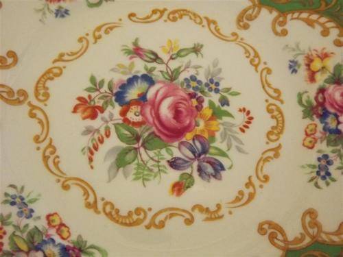 THIS PATTERN HAS : Green background, gold filigree, multi color flowers, and gold trim