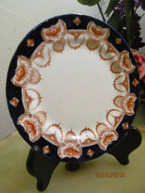 THE PATTERN IS SIMILAR TO THE LOVAIN PATTERN BY ROYAL ALBERT BUT WITH SUBTLE DIFFERENCES. FLORAL BLOSSOMS IN RUST RED ARE DISPLAYED IN CARTOUCHE SHAPES ALONG A COBALT BLUE BORDER WHICH OCCUPIES THE VERGE AND RIM WITH FLORAL CHAINS DRAPED INTO THE WHITE BETWEEN THE CARTOUCHE SHAPES