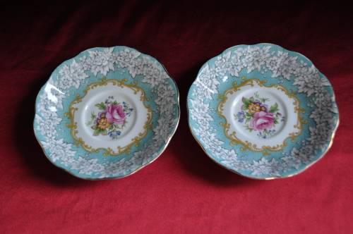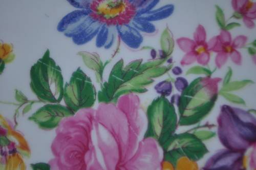 Cups: 9.5 cm in diam, 7 cm high. Saucers: 14 cm in diam. Cake Plates: 16 cm in diam. Milk: spout to handle 12 cm, 10 cm high. Sugar: 10,5 cm in diam, 6 cm high. Cake Plate: handle to handle 26 cm, 23 cm across.