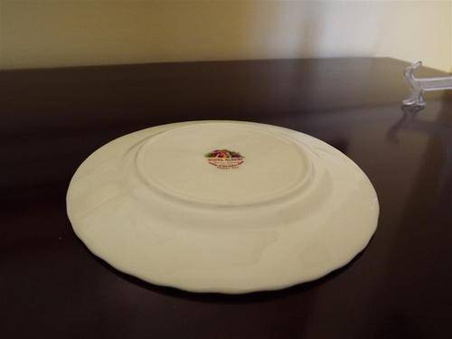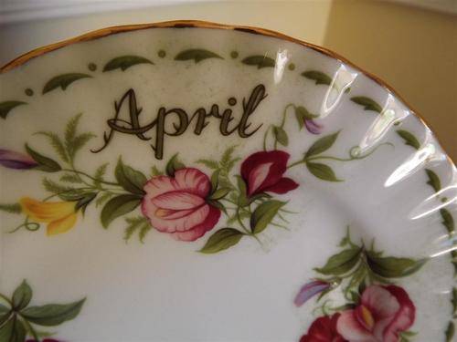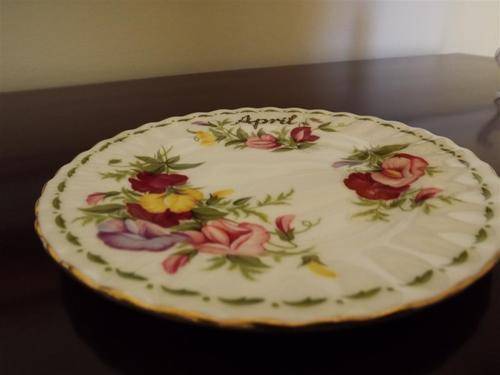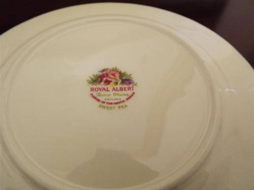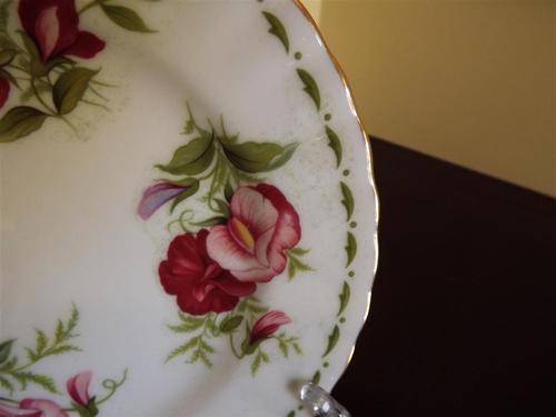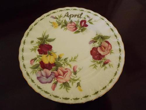 ONE ROYAL ALBERT ' FLOWER OF THE MONTH - APRIL - SWEET PEA ' TEA PLATE FOR THE COLLECTABLE FLOWER OF THE MONTH SERIES- IN GOOD CONDITION EXECPT THERE SEEMS TO BE A SLIGHT 'GREEN COLOUR' OVER SPRAY ON THE RIM AREA, BUT THIS IS NOT NOTICABLE IMMEDIATELY, PLEASE DO LOOK AT THE PHOTOGRAPHS ABOVE TO MAKE UP YOUR OWN DECISION . THE DIAMETER OF THE TEA PLATE IS 16CM. THIS IS A PERFECT REPLACEMENT PIECE OR TO COMPLETE YOUR SET.THIS ROYAL ALBERT DESIGN TEA PLATE IS NOT EASILY FOUND UP FOR SALE ON ITS OWN, SO BE SURE NOT TO MISS OUT ON THIS ! .