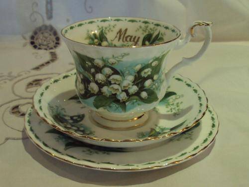 A BEAUTIFUL TEA TRIO FROM ROYAL ALBERTS' FLOWER OF THE MONTH SERIES. THIS IS "MAY" AND THE FLOWER IS "LILLY OF THE VALLEY" IT IS IN MINT CONDITION AND IS FIRST GRADE.