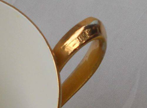 NO CHIPS, NO CRACK, SOME WEAR TO GILT ON THE TIP OF THE HANDLE