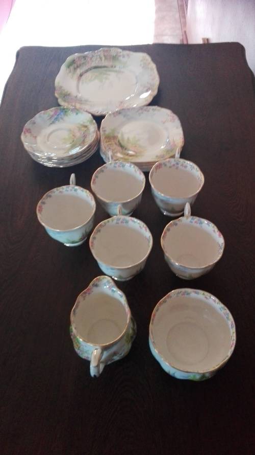 Consisits of 5xcups/6xsaucers/6xside plate/1xcake plate/1xmilk jug &1xsugar bowl(NOTE-.. 1CUP IS CRACKED)