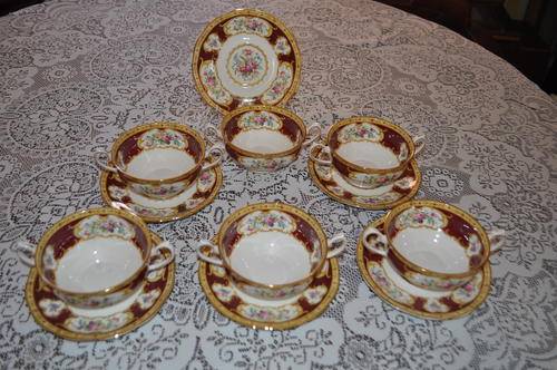 6x Soup coups 16,5cm handle to handle, 11,5cm in diam, 6cm in height. 6 x Saucers16cm in diam.