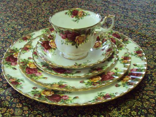 A FABULOUS FIVE PIECE PLACE SETTING IN THE OLD COUNTRY ROSES PATTERN. THEY ARE IN SUPER CONDITION, NO CHIPS CRACKS OR WEAR TO THE GILT BUT THE DINNER AND SALAD PLATE HAVE BEEN MARKED AS SECONDS BUT WE CANNOT SEE WHY.