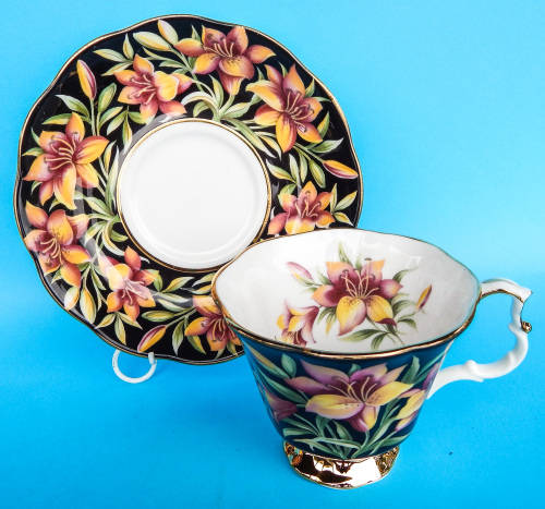 This Royal Albert, Made In England, Black Chintz " Prairie Lily " Duo is from the highly collectible Provincial Flowers Series. Gainsborough Cup Shape