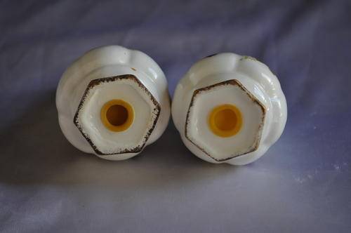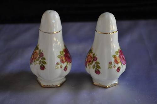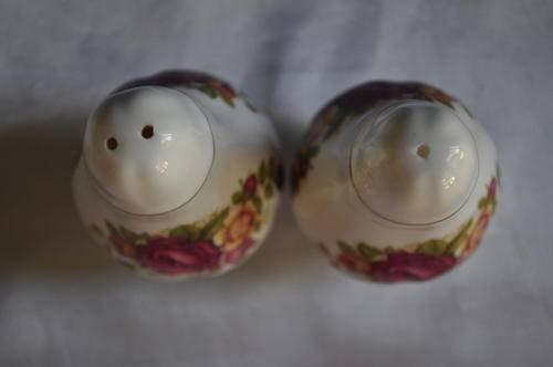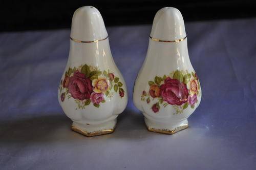 I believe these Condiments to be a variation of Royal Albert Old County Roses. An examination of similar items on E-bay indicates that not all RA Condiments have a back stamp. 10cm in height. Postage R40 - Collections Jhb/Fairland.
