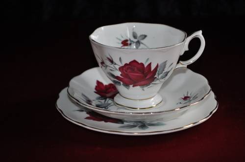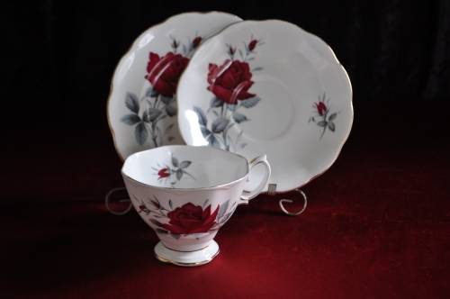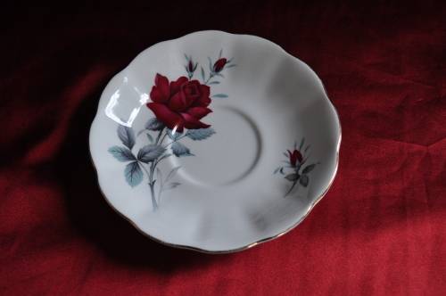 Cup: 9 cm in diam, 7 cm high. Saucer: 14 cm in diam. Cake plate: 16 cm in diam.
