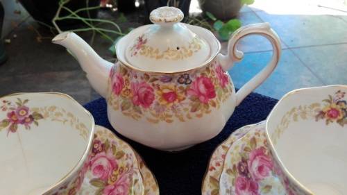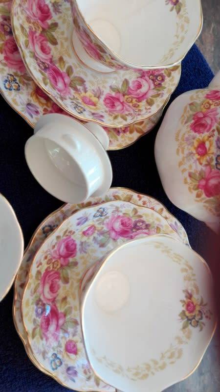 EVERYTHING IN EXCELLENT CONDITION EXCEPT FOR HAIRLINE CRACK TO ONE CUP- DOES NOT DETRACT FROM BEAUTY OF THE SET.