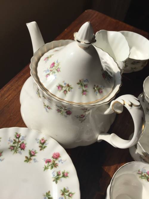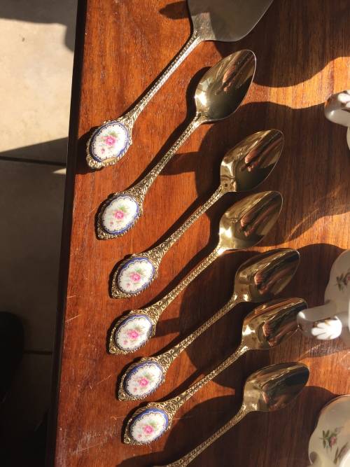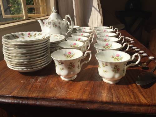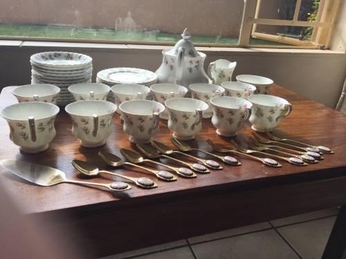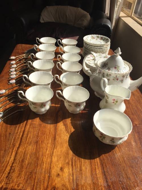 Perfect condition Royal ALbert tea set and cake set 54 pieces in VERY good condition hardly been used since 1953 the set comes with 12 tea cups, 12 plates, 12 cake plates, 1 tea pot, 1 milk pot, 1 suger pot, 1 big cake plate, 6 spoons, 6 forks, 1 cake lifter all gold plated as per photos.