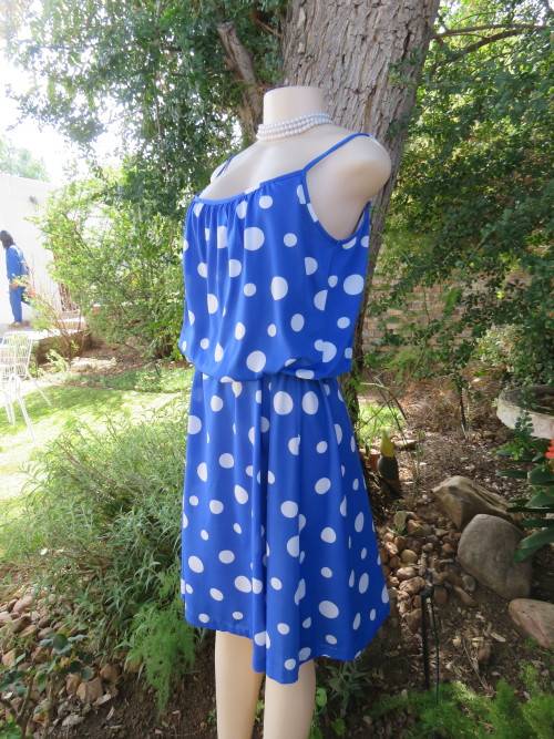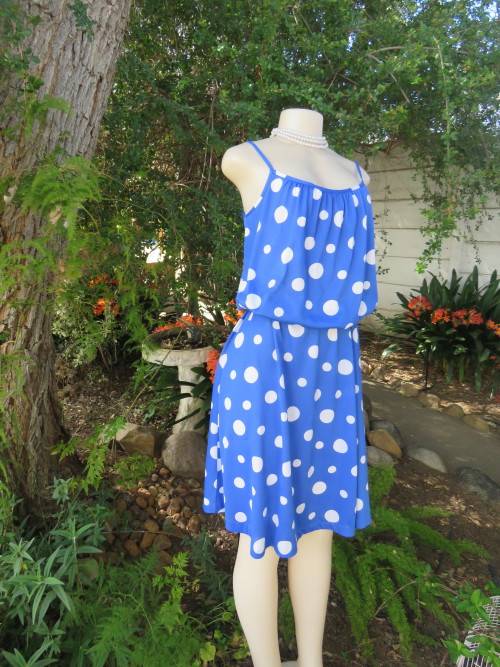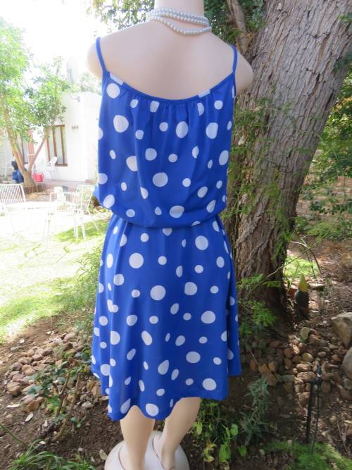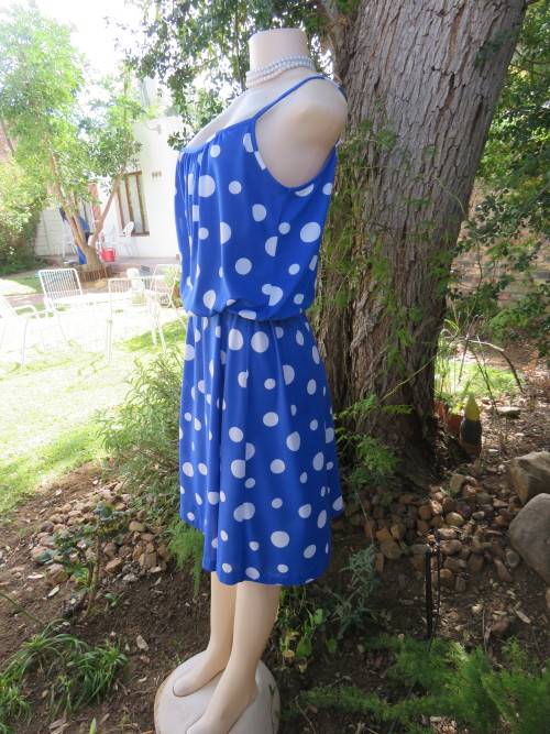 Royal blue/white polka dot strappy dress from the late 80's.Size 40/16.Top lined.Gathered front and back with blouson look.Some elastic in waist.A-line skirt.Belt loops at sides.In stretch polyester.Good cond.