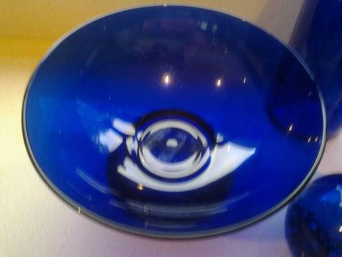 THIS IS A GREAT SELECTION OF ROYAL BLUE GLASS WARE. CONSISTING OF 5 ITEMS. 2X BOTTLES, 2X PAPER WEIGHTS WITH TRAPPED BUBBLES AND ONE BOWL WITH SILVER COLOURED METAL BASE.