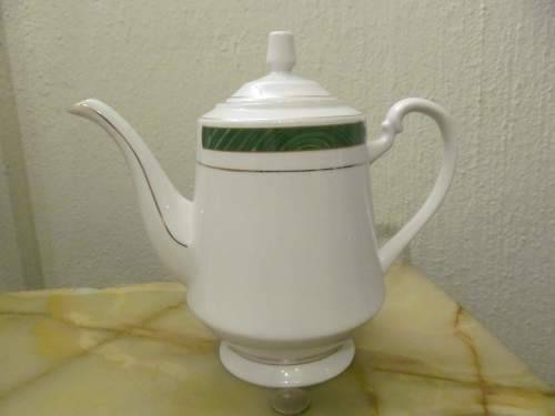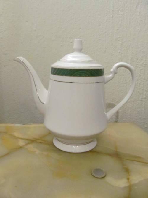 THIS ITEM IS A FINE PORCELAIN TEAPOT WHICH STANDS UPON A TRUMPET BASE, HAS A DOMED LID AND AN ELEGANT LID FINIAL. THE TEAPOT HAS BEEN DECORATED WITH THE EMERALD MARBLE PATTERN DESIGNED AND RETAILED BY ROYAL CHINA. A SPECTACULAR PATTERN WHICH IS BOTH DELICATE TO LOOK AT, YET GRAND IN ITS DESIGN. THE PATTERN DISPLAYS A PROMINENT AND LOVELY MARBLED GREEN BAND ALONG THE VERGE BENEATH THE GOLD TRIM RIM WHICH IS SEPARATED BY MEANS OF A GOLDEN SHEAF MOTIF BETWEEN EACH BAND. AN ELEGANT GOLD TRIM HAS ALSO BEEN ADDED BENEATH THE MARBLED GREEN BAND AS WELL AS UPON THE HANDLE, LID AND BASE