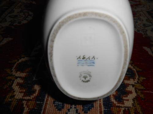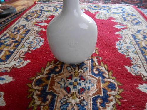 A LOVELY RETRO STYLED SINGLE BLOOM VASE BY ROYAL COPENHAGEN ALL WHITE WITHH A SPRIG OF FLOWERS EMBOSSED ON THE FRONT AND A CROWN ON THE REAR. IT MEASURES 24CM. HIGH AND IS 13CM. WIDE. ON THE REVERSE IS STAMPED ROYAL COPENHAGEN DENMARK Y Y G Y .