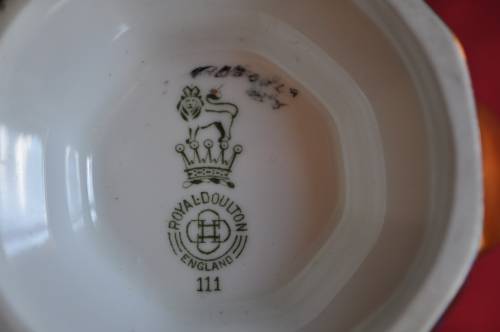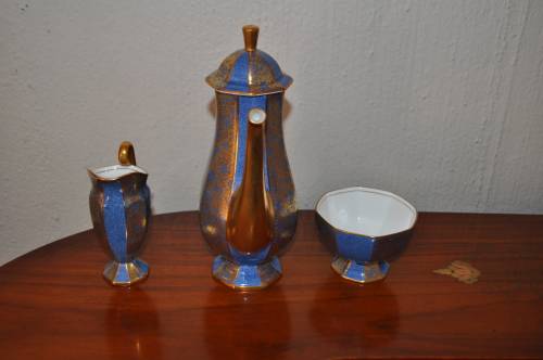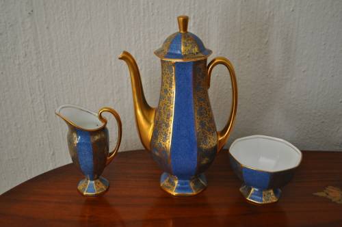 Saucers: 11 cm in diam. Cups: 6 cm in diam, 5,5 cm high. Sugar: 8,5 cm in diam, 6 cm high. Milk: Spout to handle 8 cm, 11,5 cm high. Coffee: Spout to handle 13,5 cm, lid to base 22 cm.