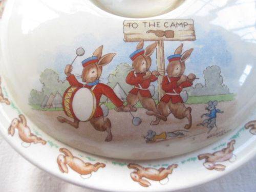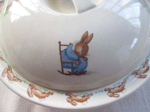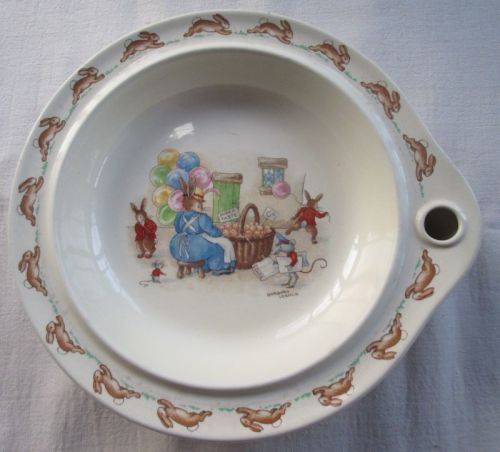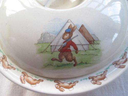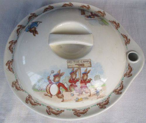 Vintage children's hot water heated porridge/food bowl, featuring Barbara Vernon's charming To The Camp design for Royal Doulton. Very good original condition, single chip on underside of lip (hardly noticeable when displayed, and missing the plug; all as pictured. Lid is intact. Tracked postage is R60.00. Postnet R100.00.