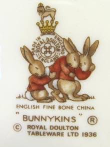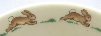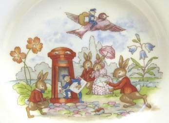 A post-1976 Bunnykins bone china 'Postman' side plate by Royal Doulton. Condition excellent -- no chips, cracks or crazing. Diameter 167 mm.