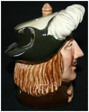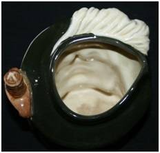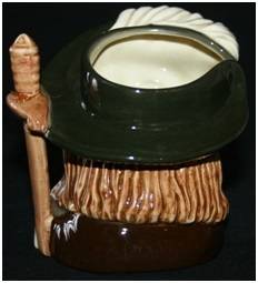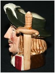 In England, the tradition of jugs or pitchers in the shape of human figures dates back to the eighteenth century. These drinking vessels became popular and referred to as Toby Jugs. It is said that they received this name after a song about a character known as “Toby Philpot” which was popular in 1761. In 1933, Charles J. Noke developed a new type of figural jugs. The pitcher (jug) was made of a head and shoulders rather than full-figure. He designed a series of jugs, each of whom depicted a famous person or character in English history, literature and song.