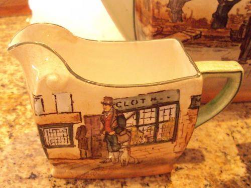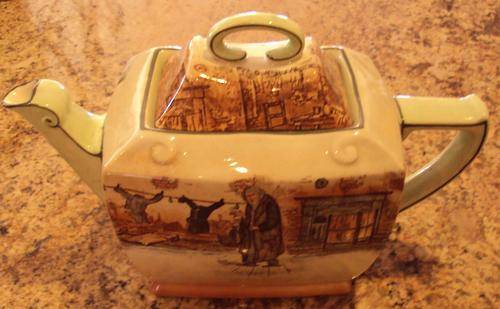 A FABULOUS DICKENS TEAPOT MILK AND SUGAR, FAGIN, BILL SYKES AND TONY WELLER THE CONDITION IS VERY GOOD FOR THEIR AGE, A SMALL CHIP TO THE INSIDE RIM OF THE MILK JUG AND A PROFESSIONAL REPAIR TO A CHIP FROM THE BOTTOM OF THE SPOUT RIM ON THE TEAPOT (NOW INVISIBLE) THEY ARE IN THE FRIAR SHAPE AND VERY COLLECTABLE.