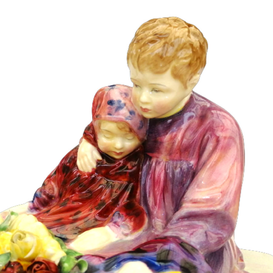 In the lively streets of Victorian London, street vendors were a common sight. In the early 20th century, Royal Doulton artists recreated these characters, including "The Flower Sellers Children," a figurine designed by Leslie Harradine in 1929. This hand-painted figurine, featuring a mix of vibrant colors like royal blues, sunny yellow, ruby red, soft pink, mauve, and green, was part of the "London's Street Vendor Series" collection, specifically the "HN" series named after Harry Nixon, the head of the Royal Doulton painting department.