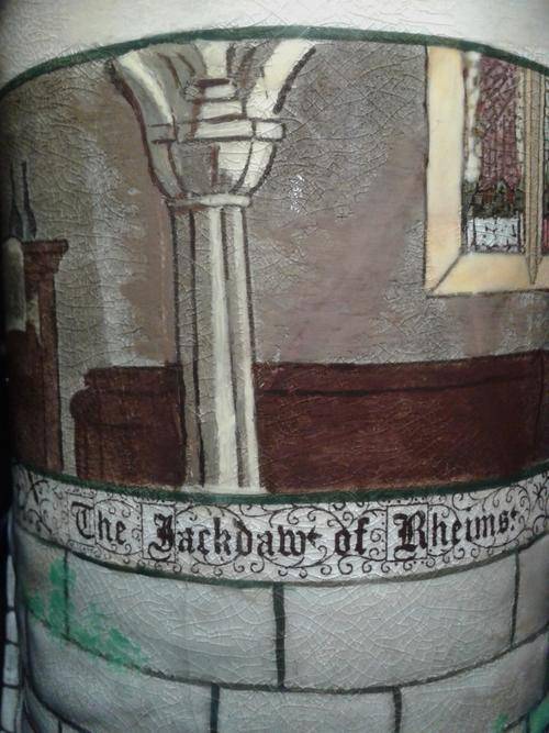 Doulton’s seriesware pattern the Jackdaw of Rheims is based on the Victorian poem by Thomas Ingoldsby of Tappington Manor, actually a pen-name of an English clergyman named Richard Harris Barham, and his verse is famous for its wit and heroic tales. Of the many Ingoldsby legends this is perhaps his most popular and so it is no surprise that Doulton chose to base a seriesware pattern uponThe story starts with a scene at the Cardinal’s Court in Rheims, where a stately feast is taking place, thereafter the cardinal’s ring mysteriously disappears, a fearsome curse is then placed by him on the unknown thief, it’s terrible effect is seen upon the poor jackdaw and finally the jackdaw’s return to favour are vividly described for us. This story was most popular and so it is no surprise that Doulton chose to base a seriesware pattern upon this story.