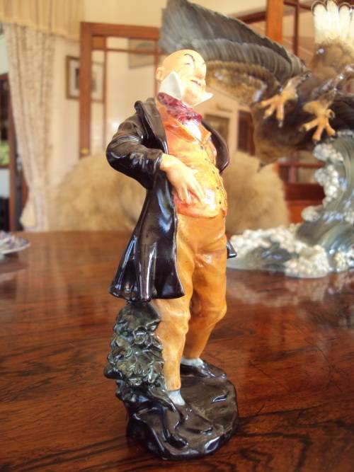 A RARE AND MUCH SOUGHT AFTER FIGURINE BY ROYAL DOULTONS' LESLIE HARRADINE, IT IS Mr. MICAWBER FROM THE DICKENS' SERIES. ISSUED BETWEEN 1938 -1952 HE STANDS 17.8cm TALL AND IS STYLE 2 IN BROWN, BLACK AND TAN.
