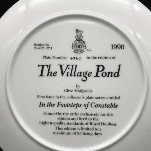 This fine bone china plate entitled ‘The Village Pond’ by Clive Madgwick is part of the ‘In the Footsteps of Constable’ series, which was produced by Royal Doulton, in a limited edition. It is in excellent condition and measures 21cm in diameter.