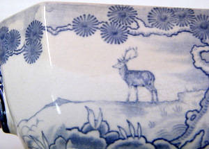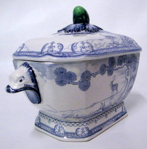 On offer this lovely Royal Doulton tureen in the Kang He pattern, in the always popular blue and white. With an interesting and contrasting green finial that looks like a strawberry on leaves and with white lion handles. With lid on, it stands 15cm tall, measures 21cm from handle to handle and the tureen only measures 16.5x11x9cm. 2 Rough spots on the rim, the one does not look like a chip to me, the other one possibly a chip but it is really very small. Some age related browning inside the tureen, underside of the lid as well as some browning outside (may fade with a bit of JIK water). Perfect to complement any blue and white collection, a must for the Kang He collector.