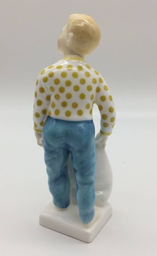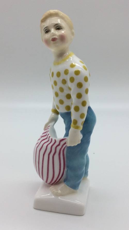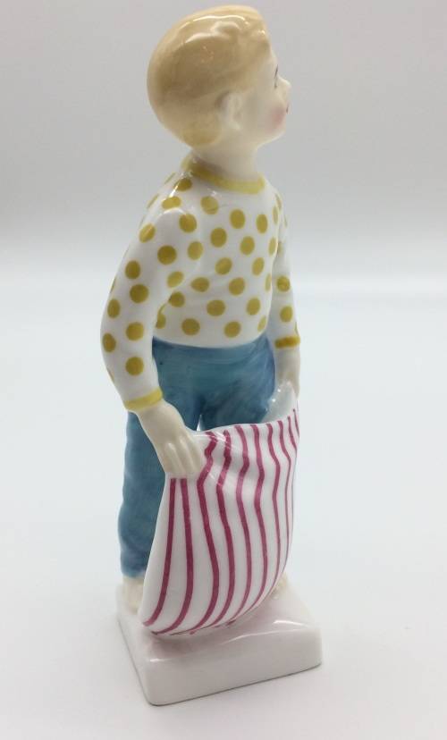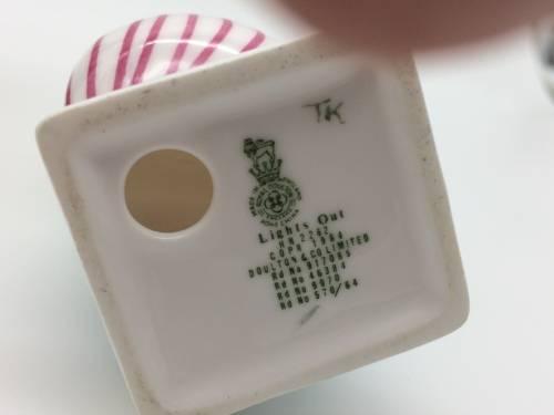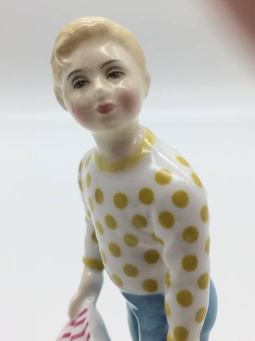 This cute hand painted Royal Doulton Figure Lights Out (HN2262) of a little boy in blue trousers and a yellow spotted shirt was designed by M Davies. He was issued in 1965 and retired in 1969, so was only in production for 4 years, which makes him a fairly rare figure. He measures 13cm in height and is in excellent condition.