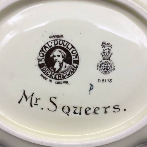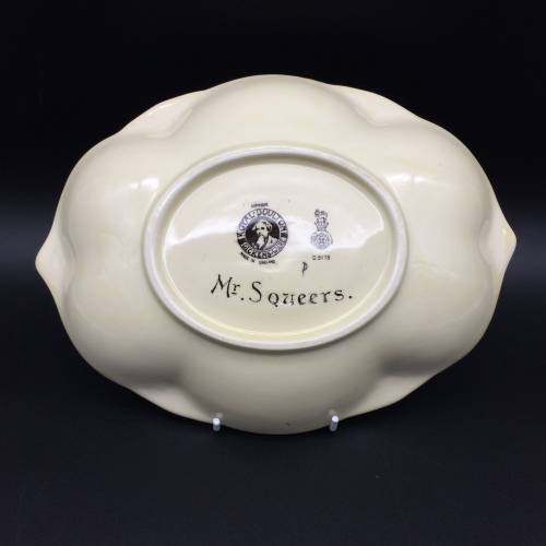 This lovely, Dickens ware bowl, designed by Charles Noke, is a shape not often seen, known as the 'clover leaf tray' (shape 8097). It features 'Mr. Squeers', a Dickens character that you also don't see very often. He was the illiterate schoolmaster in the novel 'Nicholas Nickleby' by Charles Dickens. The bowl has 'Nokes' signature on the front and the Royal Doulton back stamp and the pattern number 'D5175' on the back. It is in excellent condition and measures 23.7cm x17.8cm.