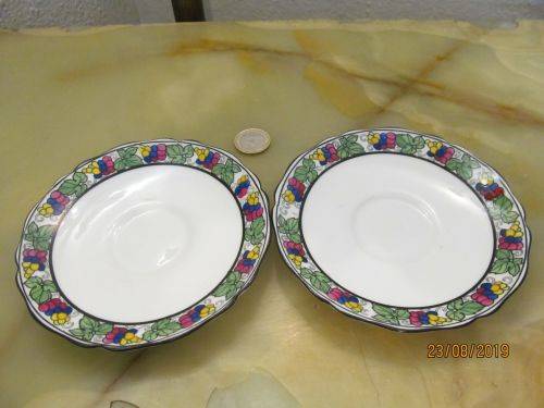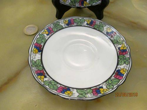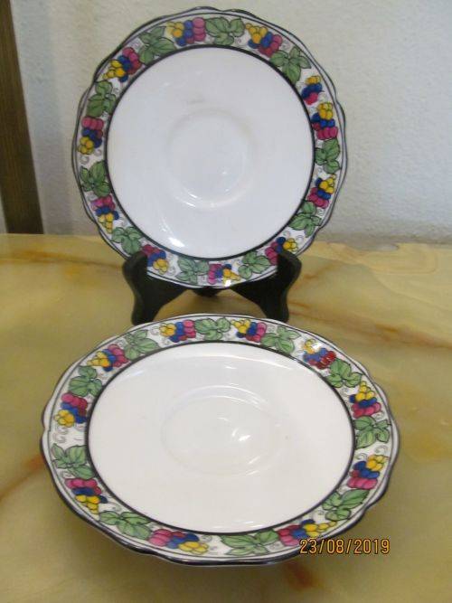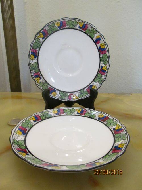 A LOT/SET OF TWO IDENTICAL, RARE PATTERN H2139 ROYAL DOULTON FINE PORCELAIN REPLACEMENT SAUCERS WHICH WERE MANUFACTURED BETWEEN 1923 and 1927, EACH DESIGNED WITH A BLACK TRIMMED SCALLOPED RIM DECORATED WITH A BAND OF ART DECO STYLED LEAVES WITH MULTI-COLOR GRAPES.