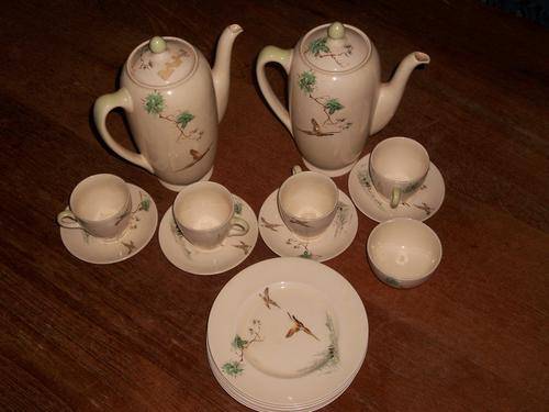 2X TEAPOTS, 4XCUPS AND SAUCERS SMALL SIZE, 1X SUGAR BOWL, 6X SIDE PLATES