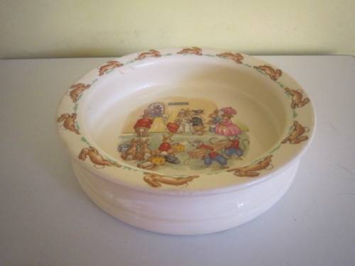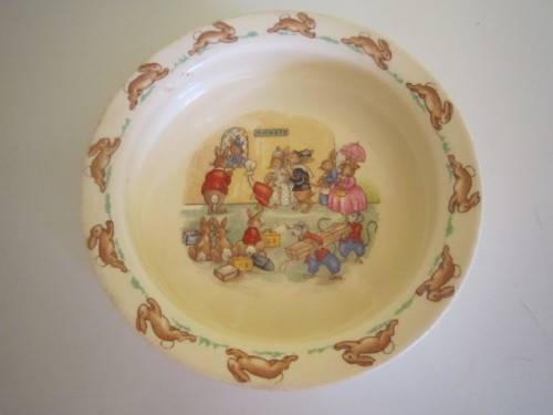 Vintage classic old Royal Doulton Bunnykins porridger, There are no cracks or crazing but there is a tiny bit of discolouration around in some places on the outside of the base, but it is very mild and not a problem. This series is very collectable and has bought out the full range of china ware for babies and small children, lovely item in overall brilliant condition. 16cms wide and long, 4.2cms high, postage will be 80.00.