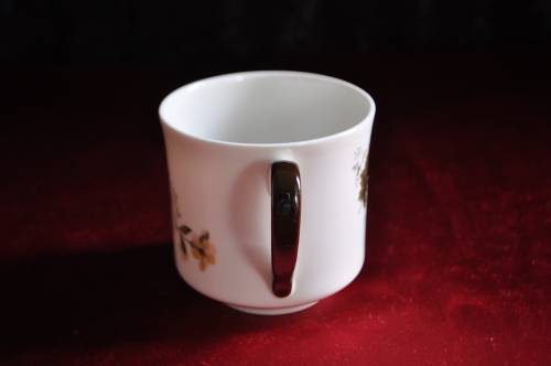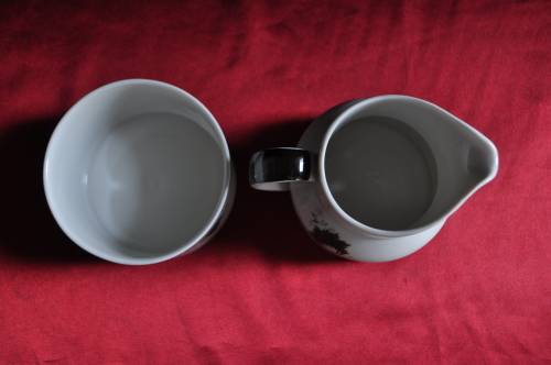Cups: 7,5 cm in diam, 7,5 cm high. Saucers: 15,5 cm in diam. Cake Plates: 16 cm in diam. Milk: spout to handle 11 cm, height 10,5 cm. Sugar: 10 cm in diam, height 6 cm. Cake Plate: handle to handle 26,5 cm, 23,5 cm across.