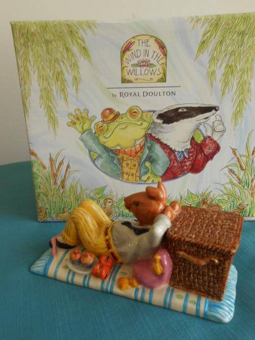 Ratty enjoys a delightful picnic on the bank of his beloved river. The vivid colours appear not only in his clothes but on the cushion, cup cakes and apples.