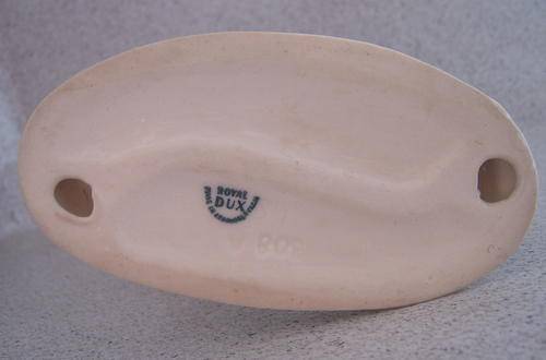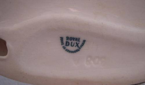 As the Fasold family had just died, the newly established 'Duxer Porzellanmanufaktur A.G.' bought the porcelain factory Porzellanfabrik Fasold & Eichel in Blankenhain (Thuringia) and at the same time liquidated their own facility in Šelty. The facility now started to produce porcelain, apart from the traditional products. In 1900, the well known mark was introduced in its basic form but at least three other marks exist as you can see in the 'Marks' section. The mark best known today shows a pink coloured triangle and the inscription 'ROYAL DUX BOHEMIA' around an acorn (derivated from the name Eichler, as 'Eichel' means 'acorn'). For the first years (until around 1918) the acorn had an 'E' for 'Eichler' in the middle, but it was later changed to a 'D' for 'Dux' whereas the 'M' can be found on items produced after 1953 when the company took over the former 'Porzellan- und Steinzeugfabirk Carl Spitz' (owned by Dr. Adolf Fischer) in the former town of Brüx which 1945 had been renamed to Most.