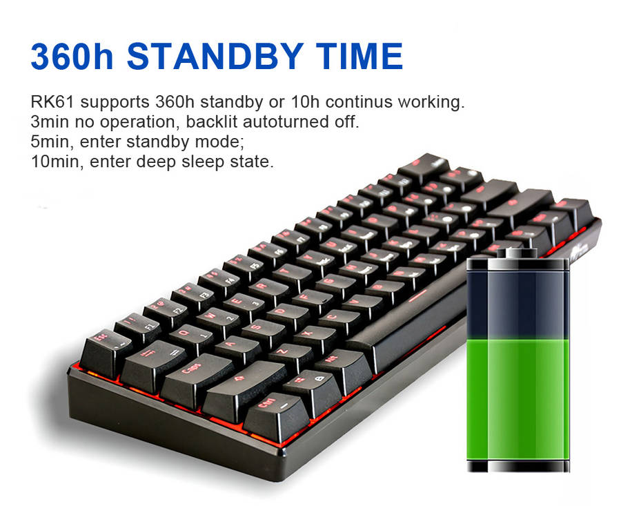 1. Brand: Royal Kludge (RK) 2. Model: RK61 RGB Version 3. Color: Black, White 4. Material: ABS 5. Switch: RK Brown Switch, Red Switch, Blue Switch (Note: RK61 have many versions with different brand switch, and this product link sells the RK switch version.) 6. Connection: bluetooth + USB Wired Dual Mode 7. Layout: 61 Keys 60% Keyboard Layout 8. Backlit: RGB Backlit 9. Dimension: 290 * 100 * 35mm