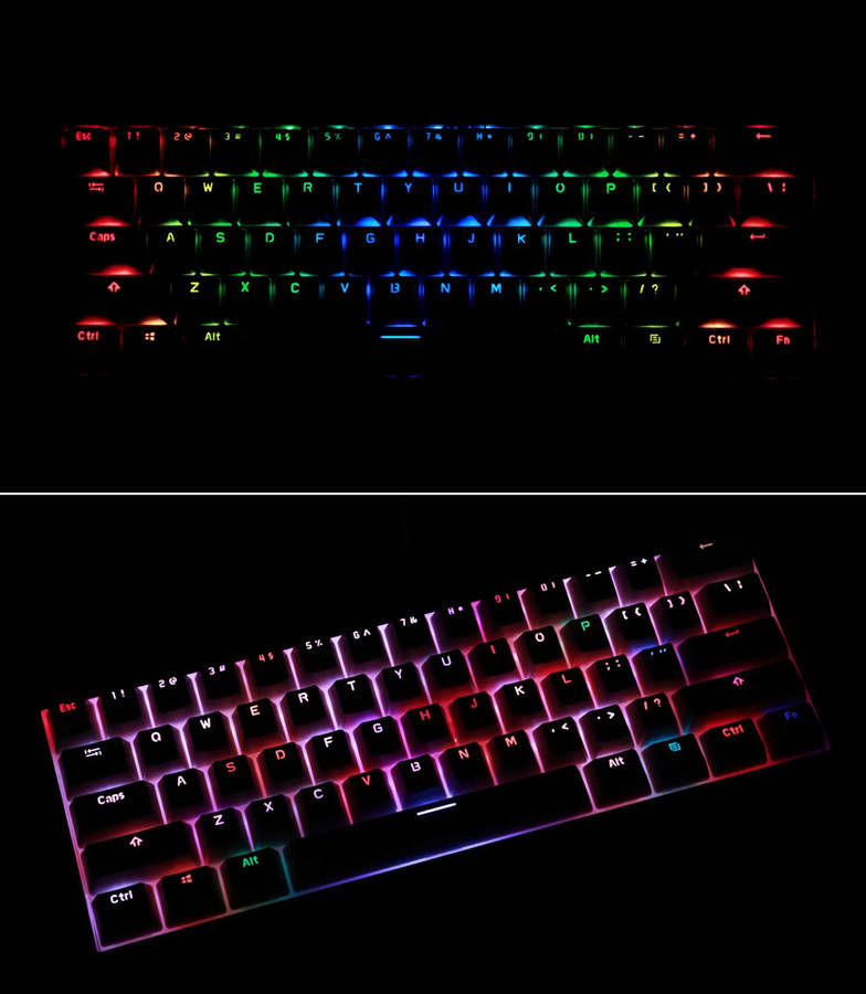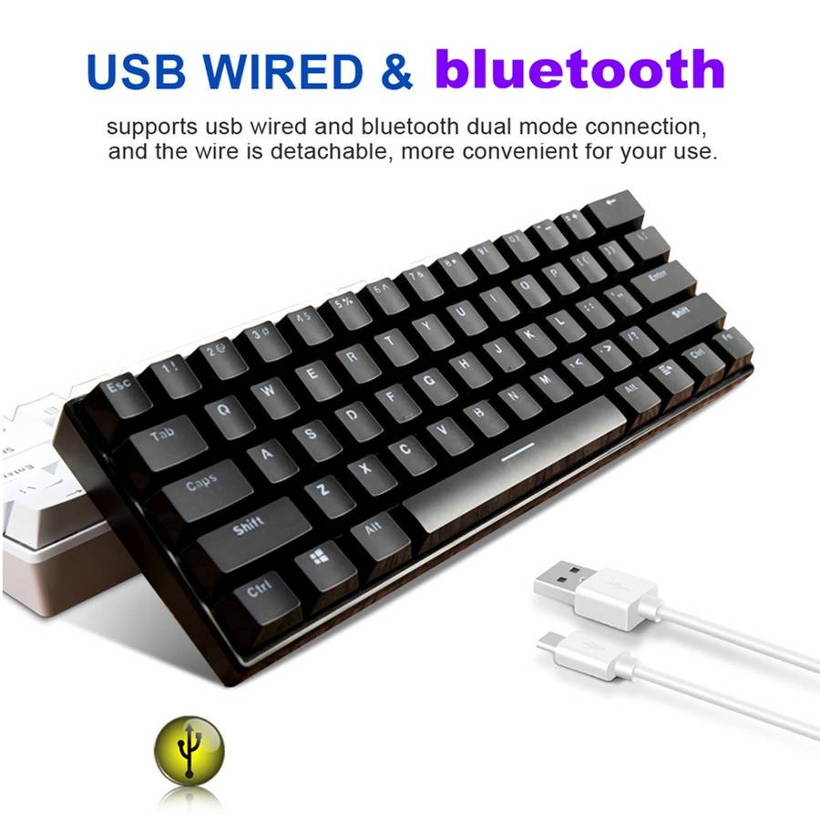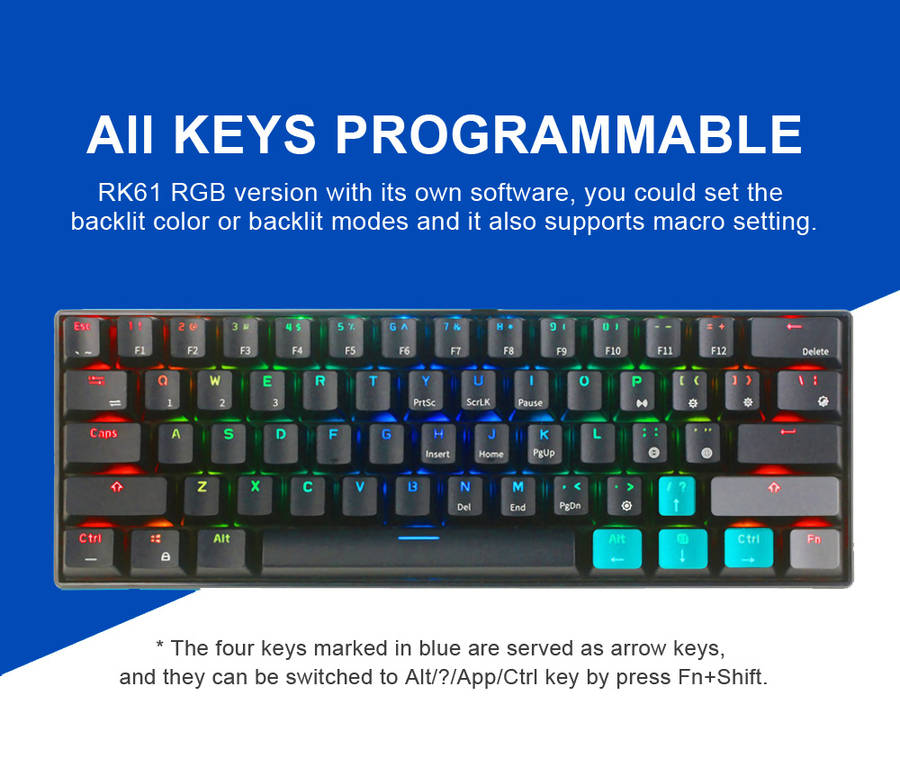 1. Royal Kludge RK61 is with a ultra compact 61 keys layout, easy to carry. 2. Supports bluetooth and USB wired dual-mode connection. bluetooth connection supports connecting 3 bluetooth devices at the same time, press FN + Q, FN + W, FN + E to switch to. 1.8m USB Cable is a detachable cable design, more convenient for your use. 3. Adopting double shot molding ABS keycaps, nearly 1.5mm thick, durable and anti-wear. 4. RGB backlit displaying, and with 17 backlit modes for option. 5. Widely compatible, compatible with Windows, iOS, Android; not only use with desktop computer, but also can be conneted with laptop, tablet or mobile phones. 6. Supports NKRO in wired mode. 7. Driver link: