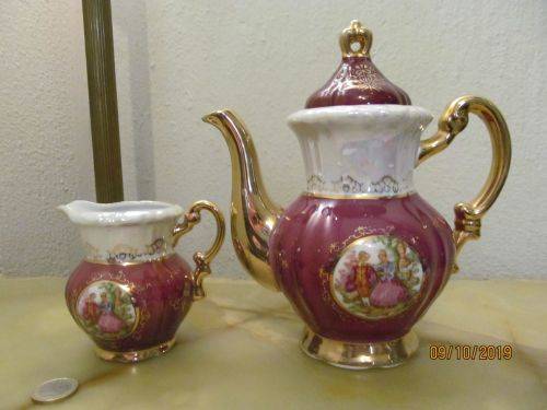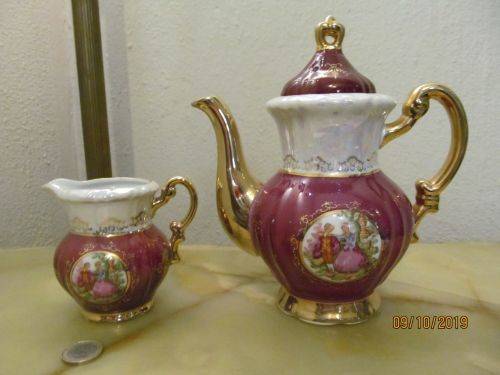 THE SET CONSISTS OF A TEAPOT AND CREAMER, ALL IN A ROYAL MAGENTA PURPLE IN MAGNIFICENT LUSTER ALONG WITH A PEARLESCENT WHITE AND ABUNDANT GOLD TRIM AS WELL AS GOLD CHINTZ PATTERNING. EACH ITEM IN THE SET/LOT IS ALSO DECORATED IN A BEAUTIFUL ROMANTIC FRAGONARD SCENE WITHIN A ROCOCO SCROLL GOLD MEDALLION