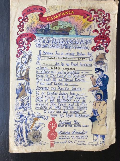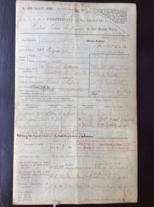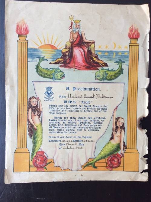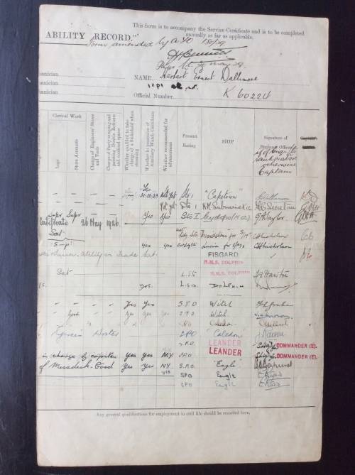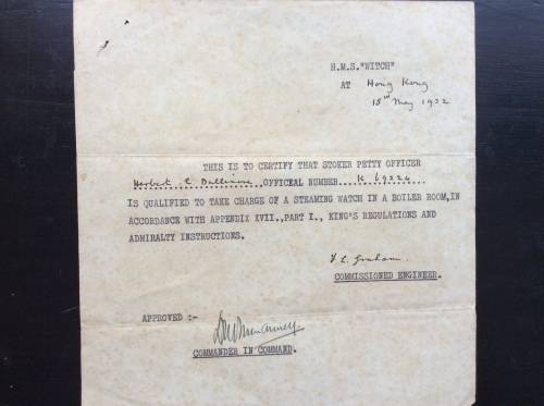 Engine Room Branch certificate enclosure containing 15 pages of documents listed below to H.E. DALLIMORE RN no K 60224 The doc's reflects their age. 1)Certificate of Service in the Royal Navy.Volunteer date 14th March 1916 (age 16 years)Commencement date 15th Aug. 1918. 2)Employment and Ability record with notation "Boy 2nd Class March 14 1916. 3) Royal Navy Certificate of Educational Test Part 1 7th March 1922. 4) Steaming Watch Qualification 15th May 1932. 5) Admiralty Pension Notification 14th Aug 1940. 6) Admiralty expression of Service Rendered 12 July 1945.7) A H M S CAMPANIA certificate verifying the crossing of The Arctic Circle 19-1X-44.and a H M S EAGLE proclamation with reference to an Equator crossing. Ref photo examples Local postage and packing with tracking no R 75-00