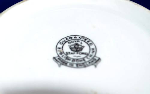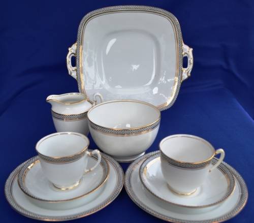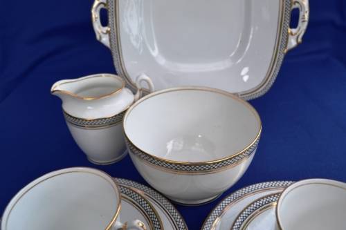 This striking set is classic white with black honeycomb pattern border, gilt bands and trim