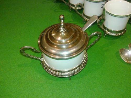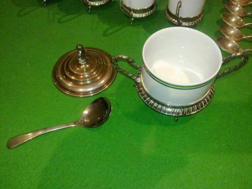 An absolute stunning coffee set from Italy. The full name is Royal Tognana Monopoli and the set is made up of 12 cups and holders. A matching sugar pot is also included. The holders are very detailed. Included is also a set of 10 teaspoons as well as nine silver plates. Please have a look at http://www.ebay.com/itm/ws/eBayISAPI.dll?ViewItem&item=390072217813&_trksid=p2992.m753 these cups go for R140 each. Spoil yourself with this stunning set!!