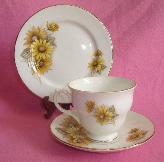 A BEAUTIFUL ENGLISH GOLD RIMMED AUTUMN FLORAL PATTERN ROYAL VALE PORCELAIN TRIO, IN EXCELLENT CONDITION, MARKED TO BASE., CONSISTING OF CUP ( height 75mm ), SAUCER ( diameter 140mm ), SIDE PLATE ( 160mm ).