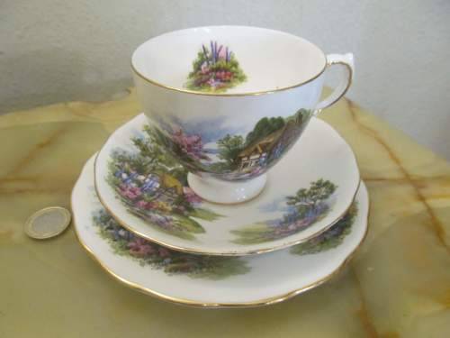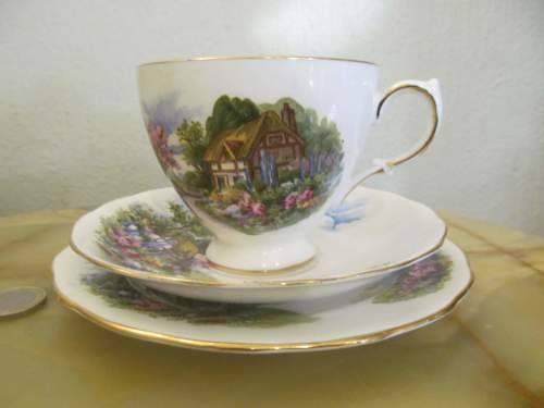 THIS TEA TRIO COMPRISES A FINE PORCELAIN TEACUP , TEA PLATE AND SAUCER WITH FLARED VERGE AND SCALLOPED RIMS ADORNED IN GOLD TRIM. EACH ITEM IS BEAUTIFULLY DECORATED IN THE COLORFUL COUNTRY COTTAGE PATTERN 7382, ONE OF ROYAL VALES HIGHLY POPULAR RELEASES