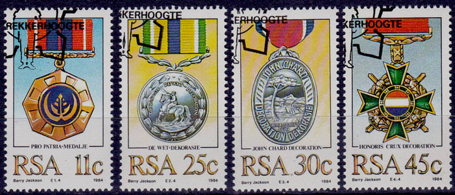 RSA, 9 Nov 1984. Military Decorations. Full set, CTO, not hinged. Full gum and black ink marks on back. View scans for condition as it form part of the description, CV R ??. Note, display card not included, and the line across the images is due to the display card that we use to scan items.