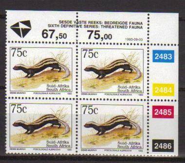 RSA 1993 6TH DEFINITIVE THREATENED FAUNA 75c MNH CONTROL BLOCK 2483/2486 PANE B DATED 1993/09/03
