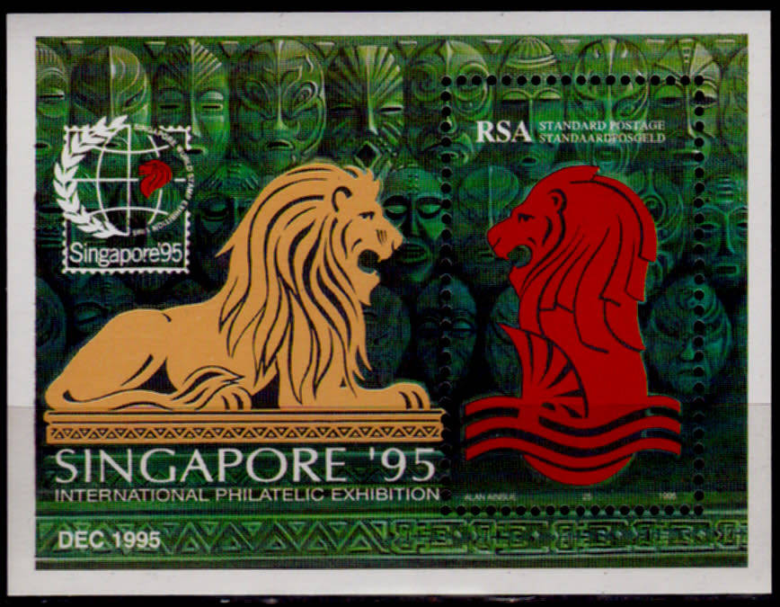 RSA, 1995. International Stamp Exhibition "SINGAPORE '95" - Singapore. Minisheet - reprint, mint, not hinged. View scans for condition as it form part of the description, CV R 13.00. Note, display card not included, and, the line across the images are due to the display card that we use to scan items.