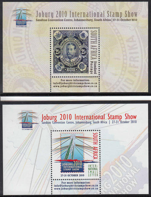 SACC 1972-1973: JOBURG 2010 INTERNATIONAL STAMP SHOW- unmounted mint 2 miniature sheets issued 9 October 2009 with Standard Postage Rate (currently R2-80) and International Airmail Small Letter Rate face values (currently R6-60). Please contact me if any further information is required. You will receive the items shown in the image.