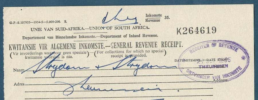 RSA Dept of Inland Revenue (SARS) Receipt Sept 1955