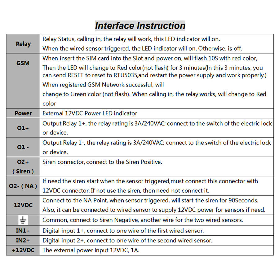- Two Digital inputs for door sensor, motion sensors or other sensors to protect your door and windows, when any one of them triggered, will send SMS alert message and start the s iren immediately;